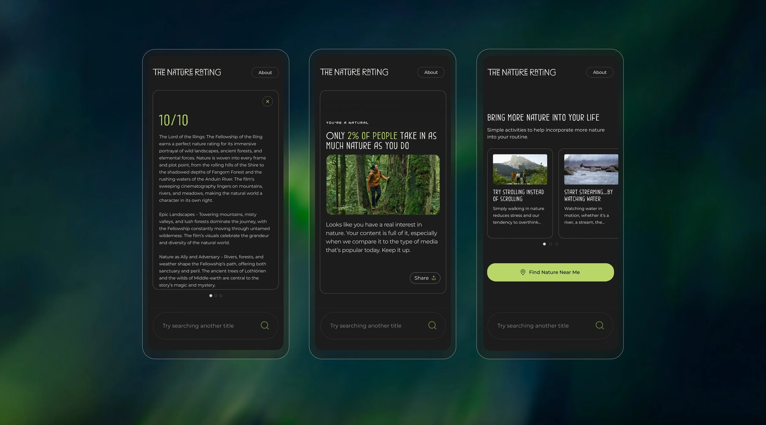 Research shows that since the 1950s, nature has been slowly disappearing from popular culture. From the lyrics in songs, to the plots of movies, to the words in books, references to nature have declined by a staggering two-thirds across the media we engage with. It’a concerning because studies suggest the less nature we see in our media, the less nature we seek out in real life. That’s not just a tourism problem for Destination BC, but a problem for nature itself, and our well-being. So, we created The Nature Rating, a new tool made to help us inject more nature into our media diets and inspire us to enjoy the outdoors. It deciphers the plots and themes of any piece of media, generating a rating out of 10. The more nature appears in the content of a book, show, song or film, the higher it scores. Each search produces an in-depth analysis explaining the reason behind the rating, even showing users how their nature consumption compares to others. Launched through a digital experience, a global PR campaign and Destination BC’s platform, the tool gives people a data-driven way to see how connected they are to nature through the content they consume and provides suggestions for simple, daily behaviours to get back outside.